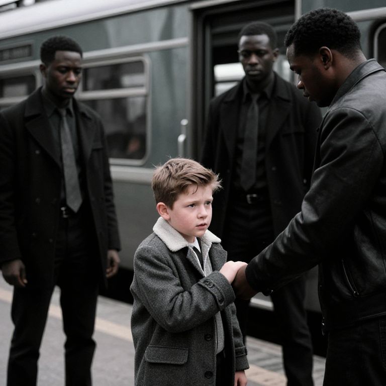 Photograph of a young Caucasian boy with light brown hair, dressed in a gray woolen coat with a white shirt collar, standing on a train platform. He looks up at an African-American man in a black leather jacket, who is shaking his hand. Three other African-American men in black attire stand in the background, partially blurred, near a dark green train. The scene is moody with a high-contrast color palette, emphasizing the boy's innocence and the men's serious demeanor. The platform's yellow line is visible at the bottom.