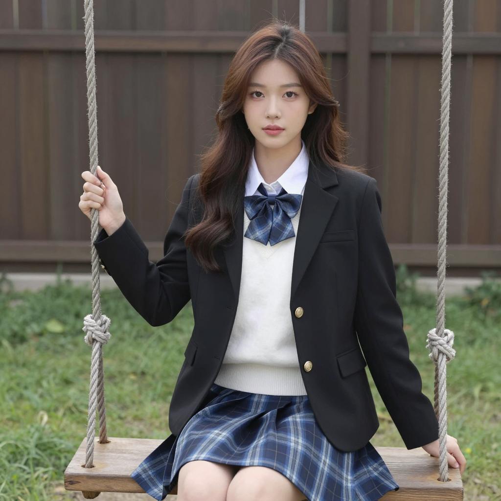 Asian woman with long brown hair, wearing a navy blue school uniform with gold buttons and a plaid skirt, sits on a concrete ledge. She holds her hair with her right hand, looking to the side. Brown handbag with "CHAMPAGNE" label on her lap. Background includes blurred building stairs and greenery. Natural light.