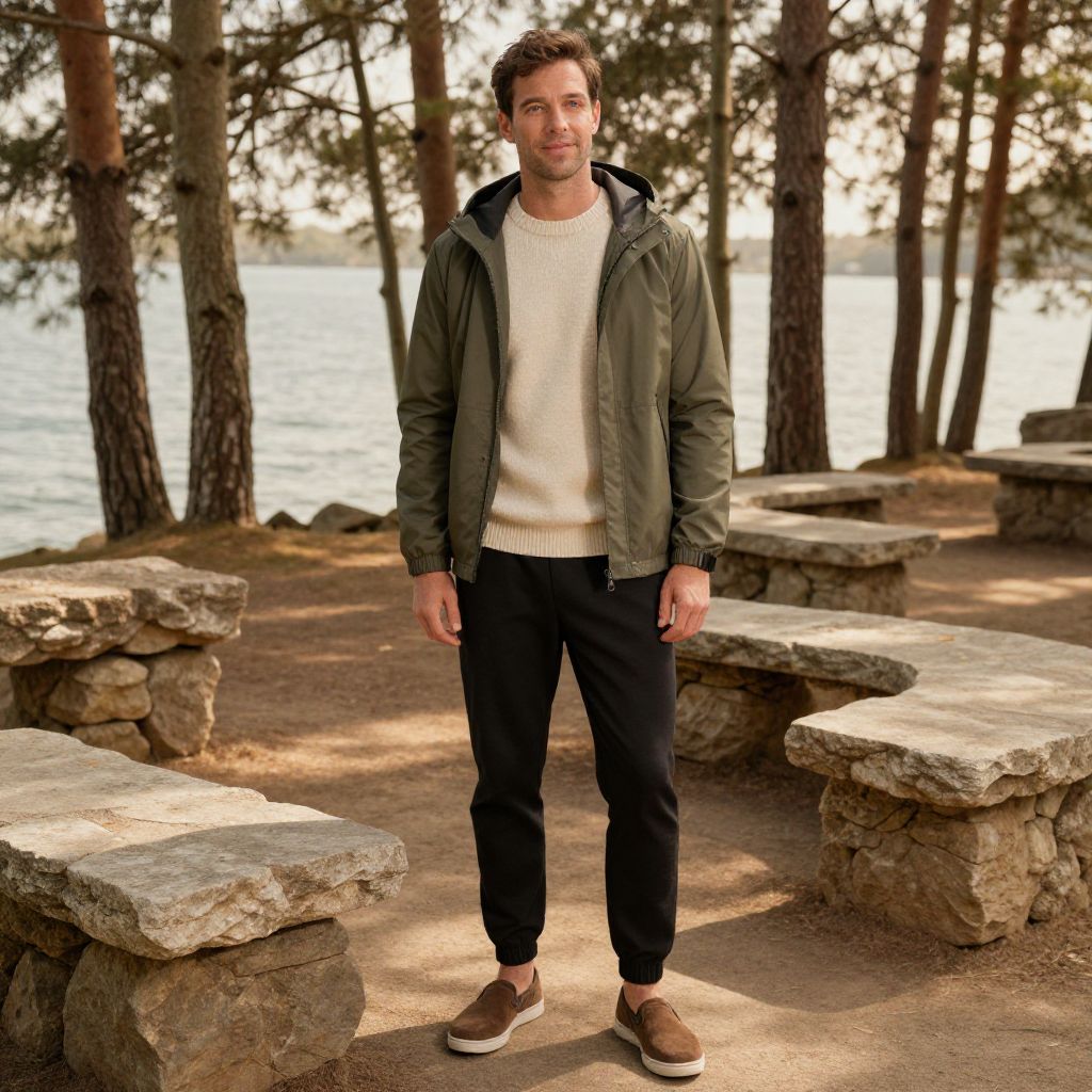 A man, olive green lightweight hooded jacket, black tapered joggers, cream knit sweater, brown suede slip-on shoes, earthy tones, rustic stone benches, warm, inviting waters, soft sunlight filtering through tall pines, tranquil atmosphere, gentle smile, ib technicolor film stock. Man has masculine face and piercing eyes
