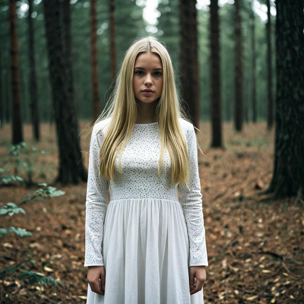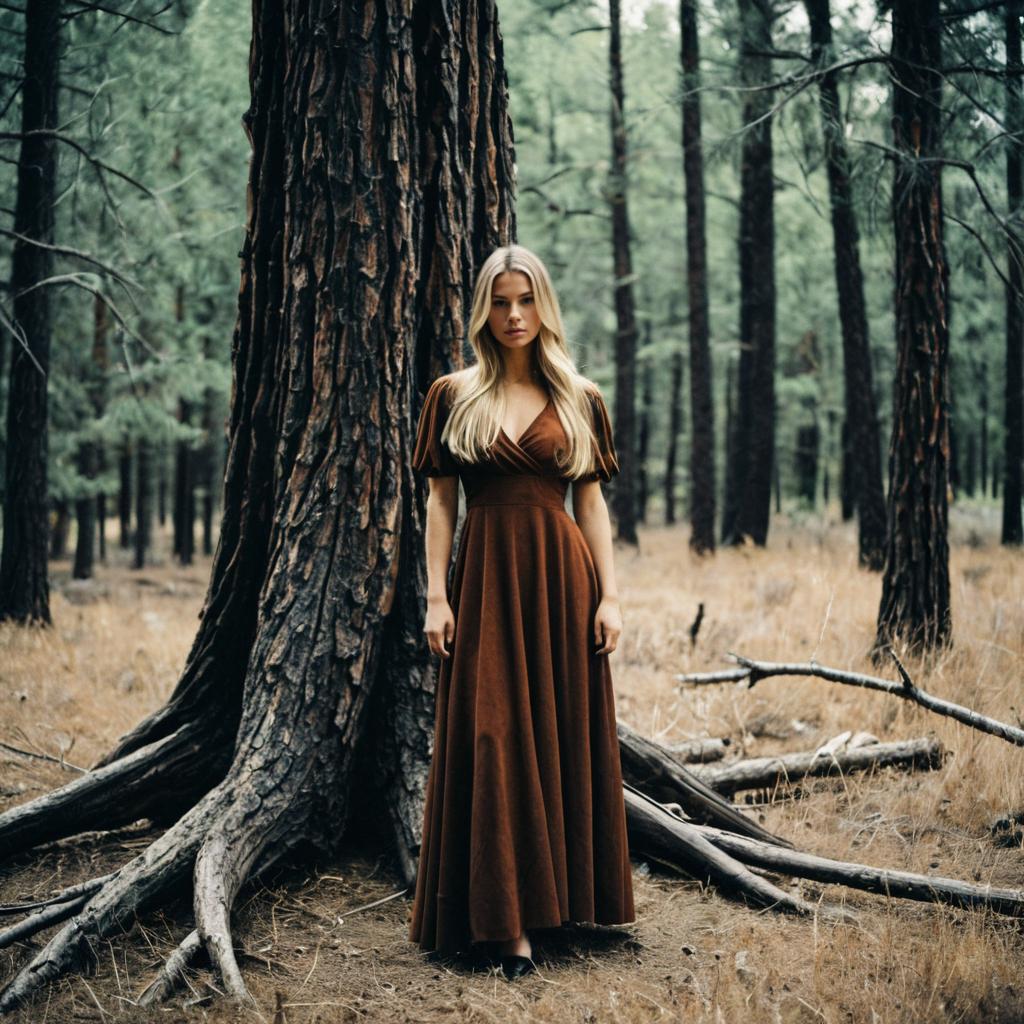 Overland clothing,1girl, dress, solo, long hair, tree, outdoors, realistic, nature, looking at viewer, blonde hair, standing, forest, sleeveless