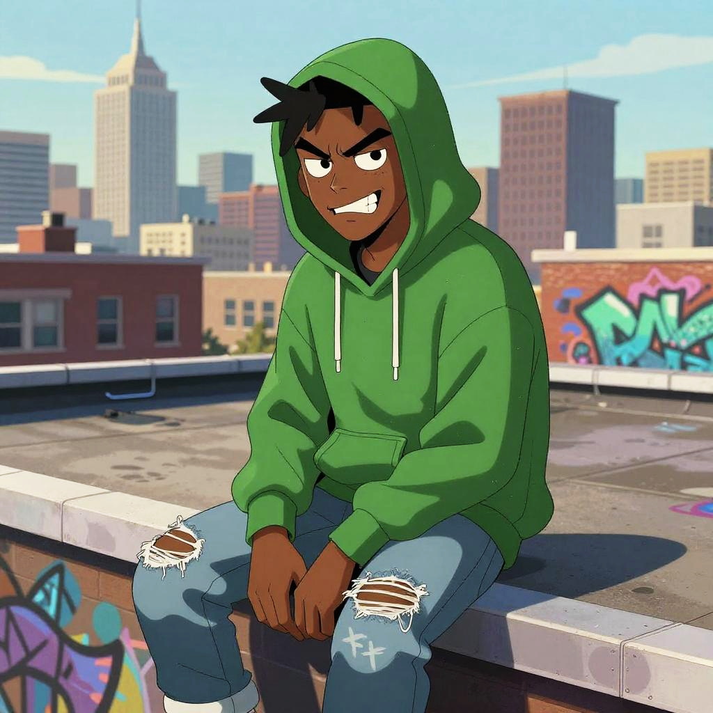 Hood custom boondocks character, mischievous expression, in a green hoodie with ripped jeans, sitting on a school rooftop with city skyline behind, animated style with bold outlines, expressive eyes, urban graffiti art influence, cinematic lighting and shadows.