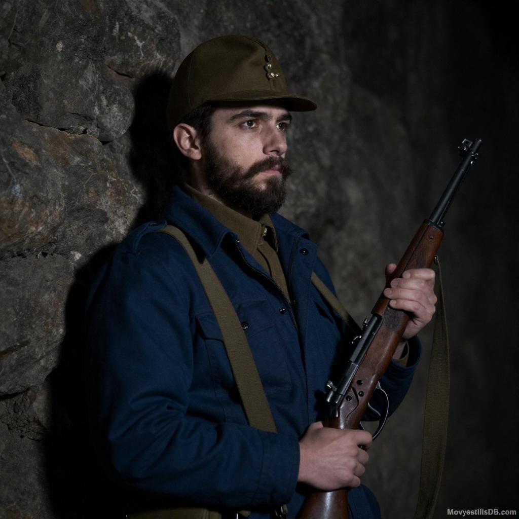 A dark, moody photograph of a bearded man with a mustache, wearing a brown military-style cap and blue jacket, holding a rifle. He is leaning against a rough, rocky wall, with shadows obscuring much of his face. The lighting is low, creating a tense atmosphere. The website "MoviestillsDB.com" is in the bottom right corner.