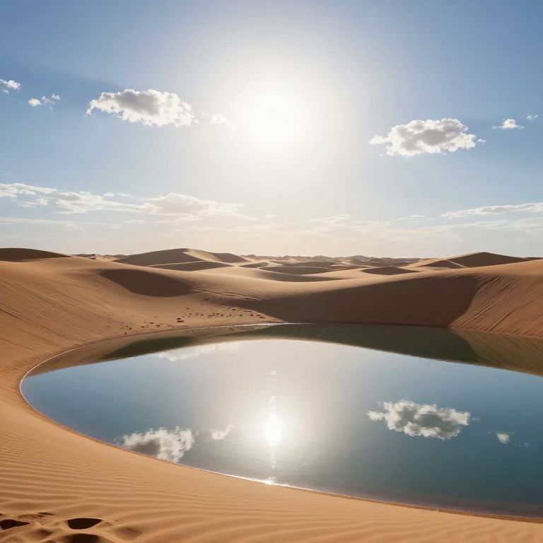 Photograph of a sunlit desert landscape featuring undulating sand dunes in the foreground and background. A reflective, circular oasis lies centered, mirroring the bright sun and scattered clouds in the clear blue sky. The sand dunes exhibit rippled textures, with subtle shadows enhancing their contours. The sun's intense light creates a stark contrast, casting bright reflections on the water's surface. The overall scene is tranquil and pristine, with the warm, golden hues of the sand juxtaposed against the cool blue of the sky and water.