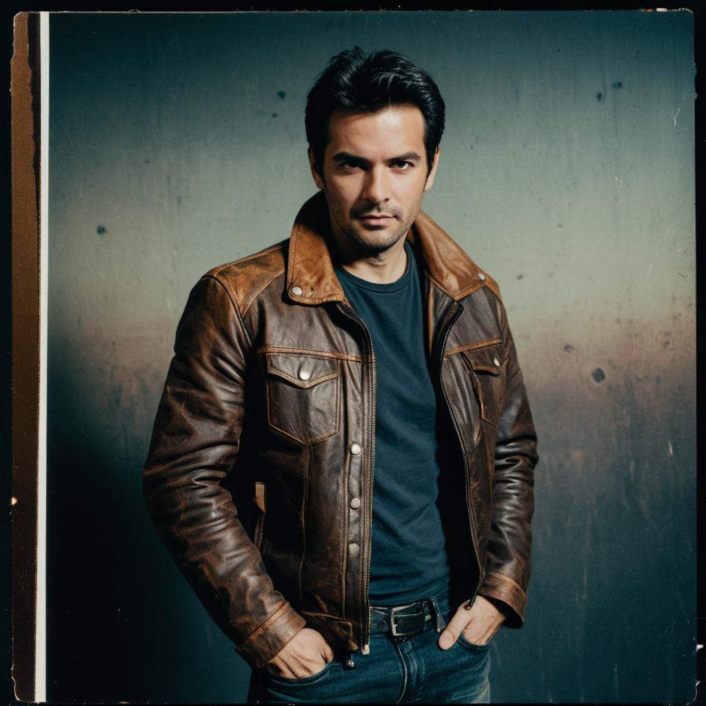 Portrait of a rugged adult male with short dark hair and a stubbled face wearing a brown distressed leather jacket over a dark t-shirt and blue jeans. The man has an intense gaze and stands against a muted, soft gradient background. Photo style resembles a vintage Polaroid.