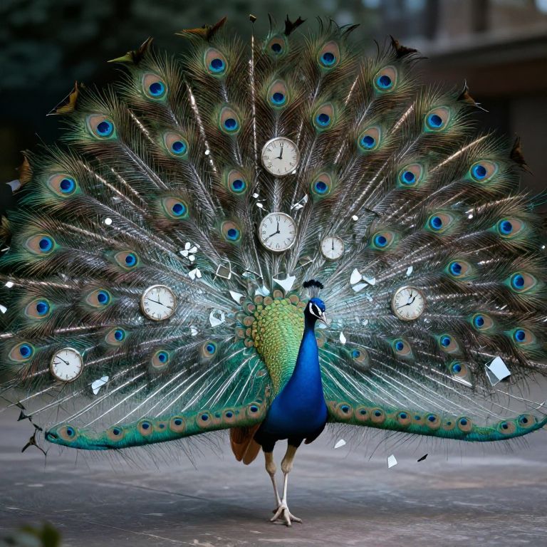 An ethereal peacock, adorned with a kaleidoscopic tail of shattered clocks, weaves a mesmerizing dance of time, inviting the observer into a realm where moments unfold like feathers, each beat of its wings rewriting the tapestry of memory and possibility.
