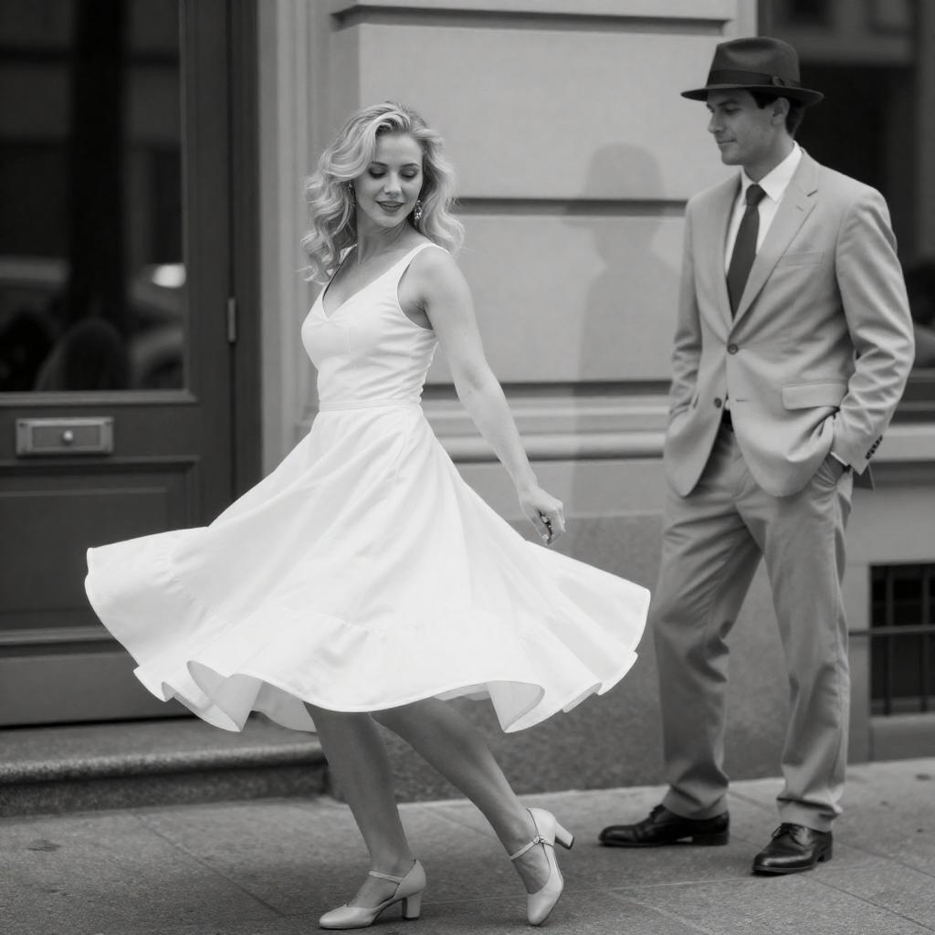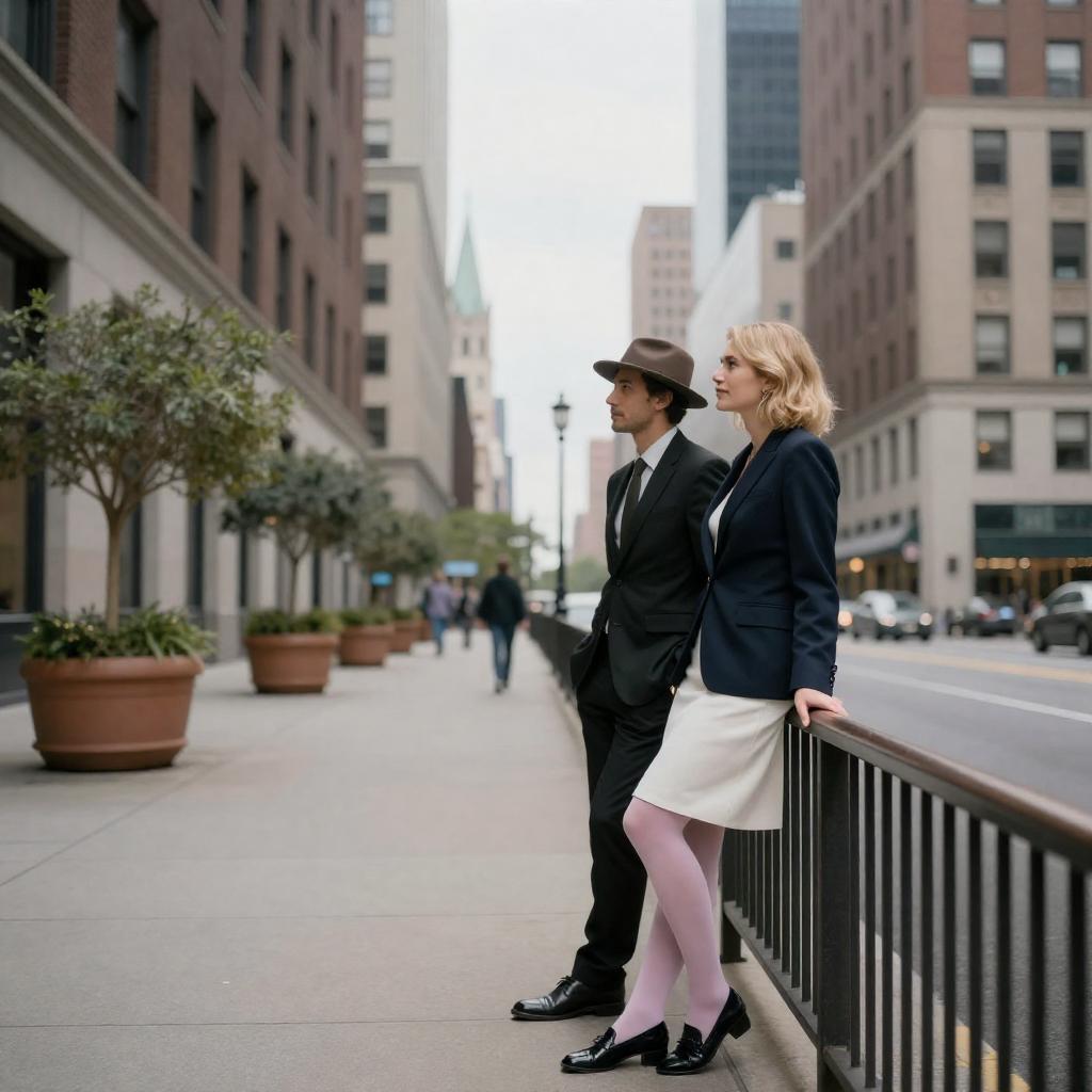Two professionally dressed individuals, a man in a black suit and brown hat, and a blonde woman wearing a navy blazer, white skirt, and pink tights, standing and leaning against a railing on a city sidewalk. The background features tall brick buildings, potted trees lining the street, a church with a spire, and an overcast sky. Two other pedestrians are visible in the distance.