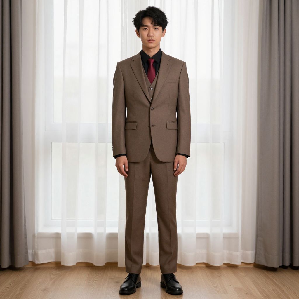 Dress clothes costume, 1boy, male focus, solo, necktie, indoors, standing, pants, full body, black hair, vest, brown pants, curtains, red necktie, black footwear, formal, window, looking at viewer, jacket, shirt, suit, realistic, long sleeves, shoes, coat
