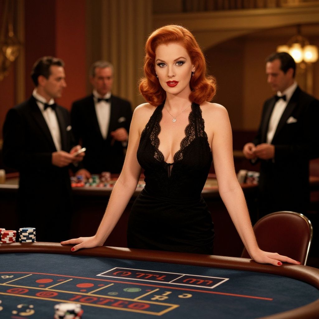 A glamorous red-haired woman stands confidently at a casino gaming table, dressed in a deep plunging black gown with lace detailing. The vintage casino setting glows with warm lighting, featuring well-dressed men in tuxedos in the background, evoking the classic 1940s or 1950s film noir style. The image captures a blend of elegance, mystery, and retro sophistication.