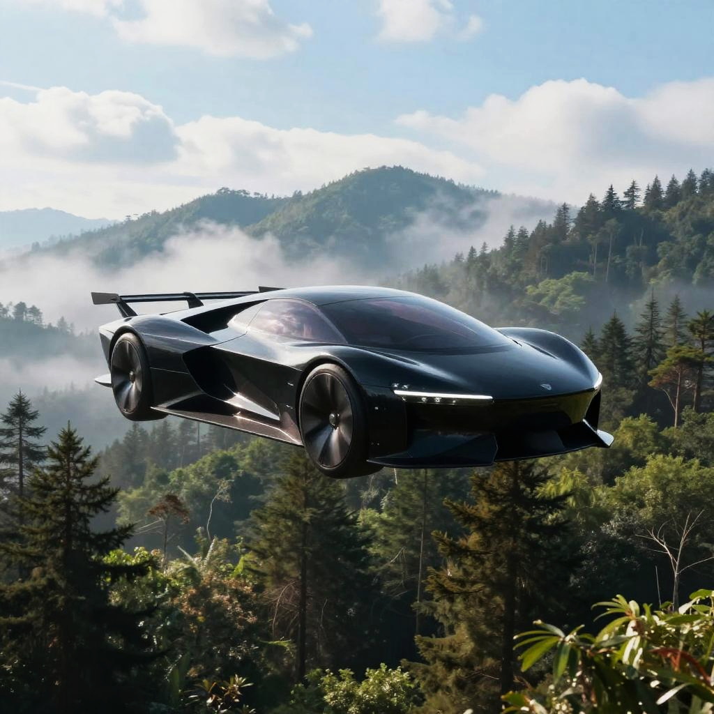 Photograph of a futuristic, rectangular flying car hovering above a dense forest of tall, green pine trees. The flying car has a sleek, metallic design with large windows and a central dome. The background features a bright blue sky with soft white clouds and a distant, misty mountain range. The image has a dynamic, almost sci-fi feel.