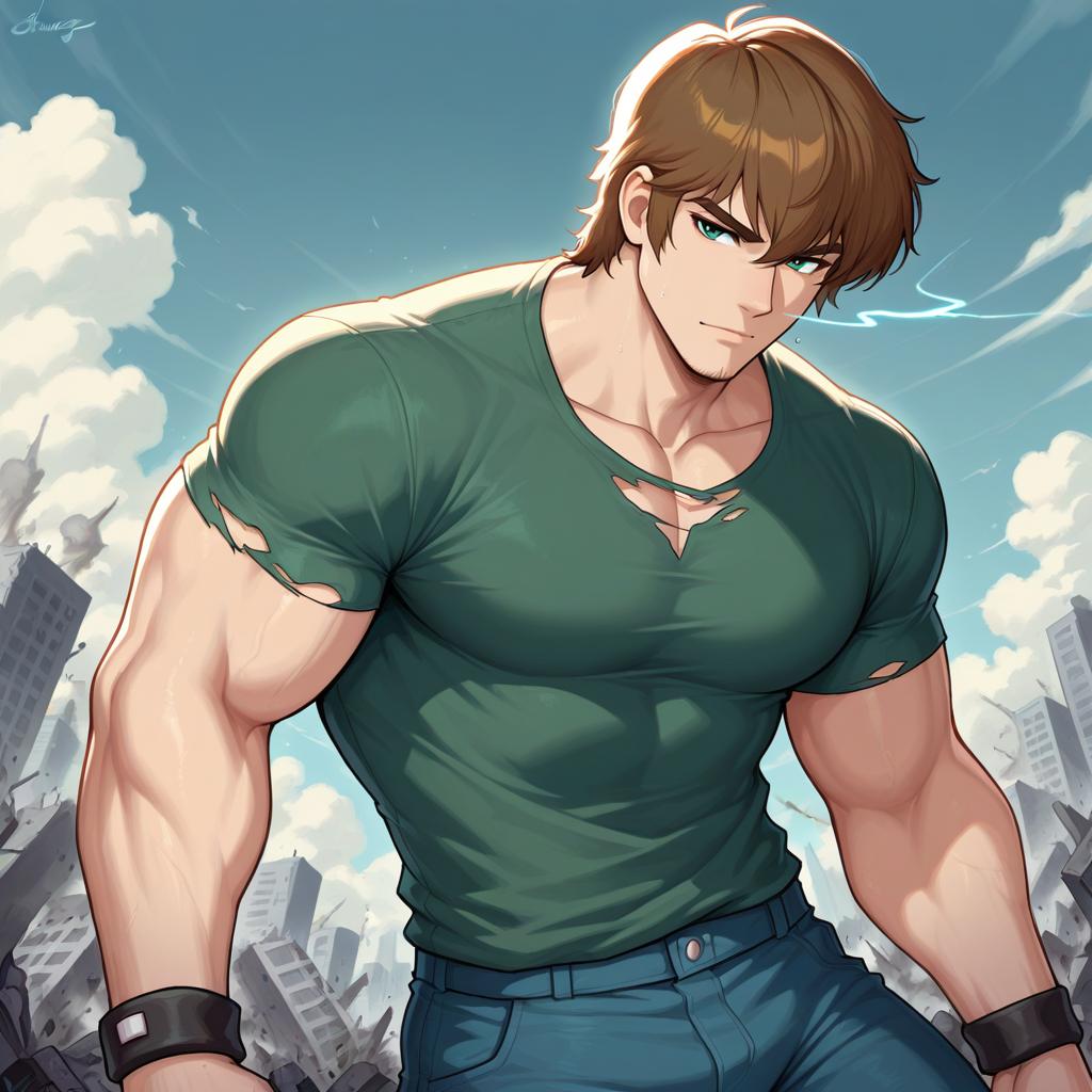 Best quality, intricate details, 1boy, buff, manly, masculine, body builder, ripped shirt, Shaggy Rogers, wild hair, destruction, white eye trail
