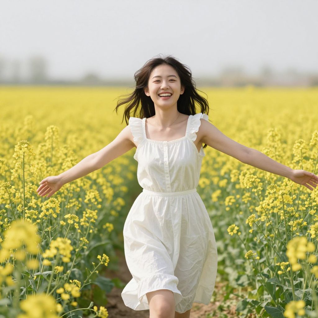 Photograph of a smiling Asian woman with black hair, wearing a white sleeveless dress, running joyfully through a vibrant yellow field of blooming can