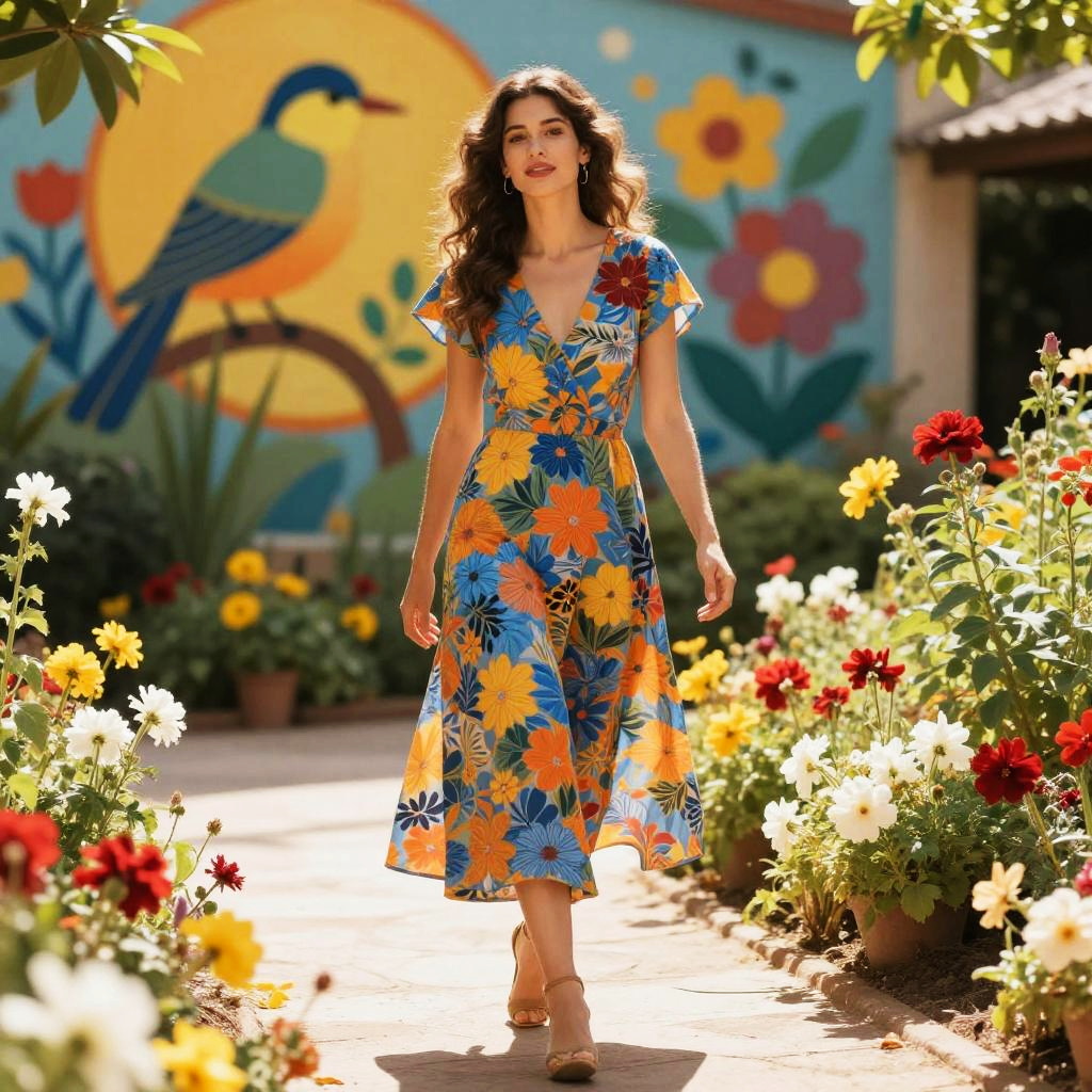 Photograph of a woman with wavy brown hair, wearing a colorful, floral-patterned dress with blue, orange, and yellow flowers. She's walking down a sunlit garden path, surrounded by vibrant flowers in red, yellow, and white. The background features a brightly painted mural with a bird and flowers. The scene is bathed in warm, golden sunlight, creating a lively and cheerful atmosphere.