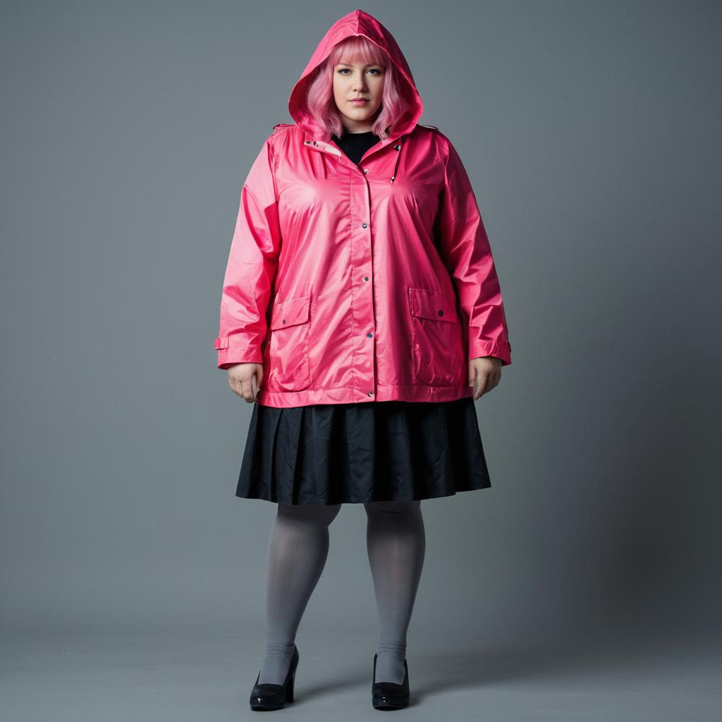 Pink woman costume plus size,solo,hood,male focus,full body,1boy,realistic,standing,crossdressing,grey background,pantyhose,pink hair,skirt,raincoat,dress
