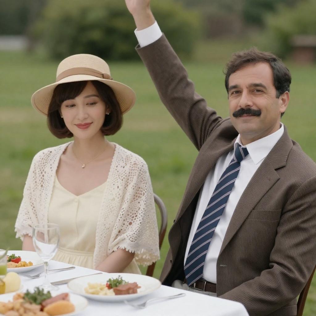 Photograph of a woman and man outdoors. Woman wears a beige hat with red rose, floral blouse with lace collar. Man wears black hat, brown jacket, holds spoon in right hand, eating from plate. Background has trees and blurred greenery. Man's face shows surprise, woman looks downward. Woman on left, man on right.