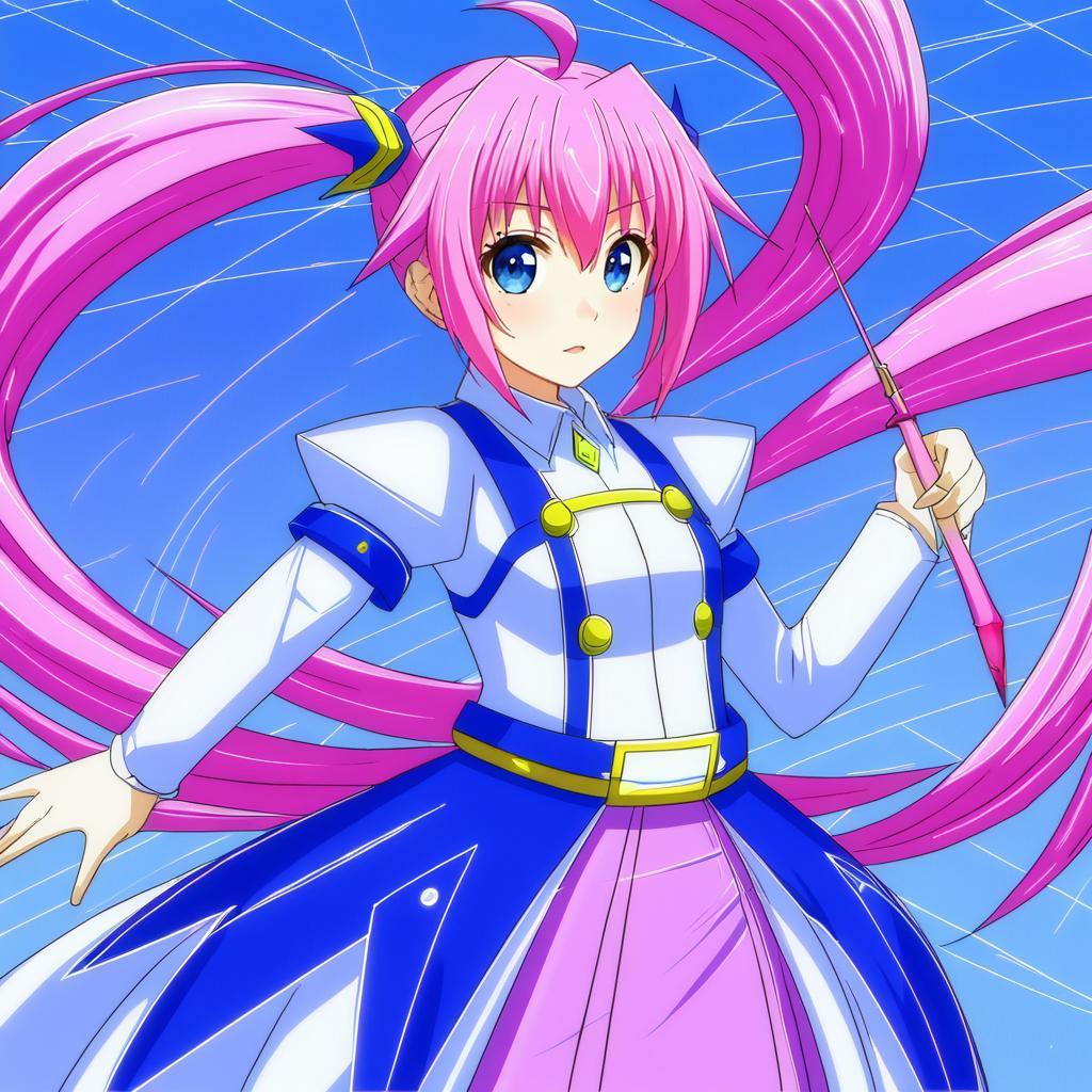 Caro ru lushe, lyrical nanoha, 1girl, blue eyes, pink hair, ahoge, by artist e10, anime