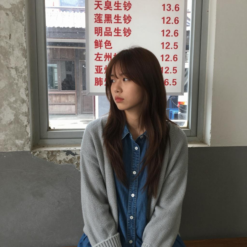 Young woman with long brown hair, wearing a gray knitted cardigan over a blue denim dress, sitting in a worn-out room. Behind her, a window with dirty glass and a white menu board with red . She looks to the right with a neutral expression. Text on the menu board includes prices and hours. Industrial setting, concrete wall on the left. One person.