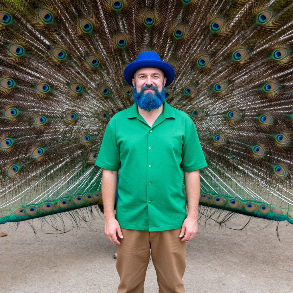 A charming man with a striking blue beard and a matching blue hat is standing confidently in front of a magnificent, large peacock. He is wearing a vibrant green shirt and earthy brown pants. The peacock's feathers are an explosion of vibrant and colorful hues, creating a dazzling backdrop.