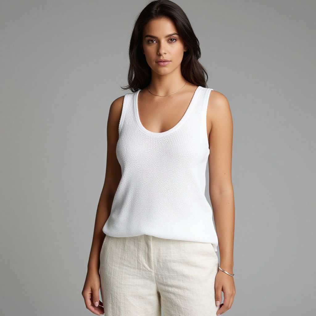 "Woman, casual, white textured knit tank top, scoop neck, sleeveless, relaxed fit, off-white linen pants, straight cut, natural waist, delicate silver chain necklace, thin silver bangle bracelet, grey studio background. Sexy. Pretty face and beаutiful eyes. Big breasts."