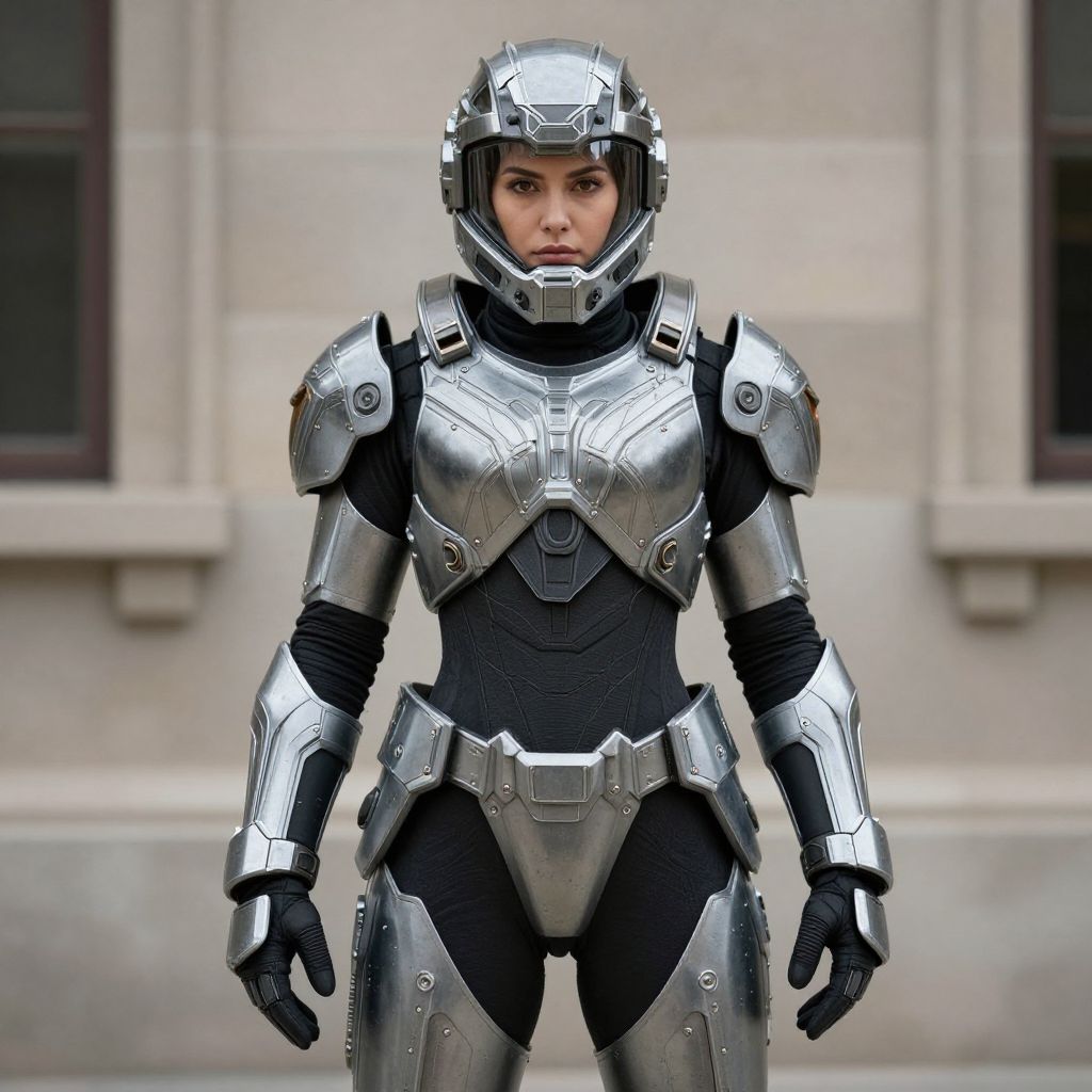 Photograph of a woman standing front-facing in a full metallic silver and black armored suit. The suit features a high-tech, futuristic design with intricate paneling and a glossy finish. She wears a matching helmet with a clear visor, revealing her focused expression. Her arms and legs are covered in armor with black padding underneath. The background is a blurred, light grey stone building with rectangular windows. The image has a realistic, high-definition style, emphasizing the sleek, modern appearance of the armor.