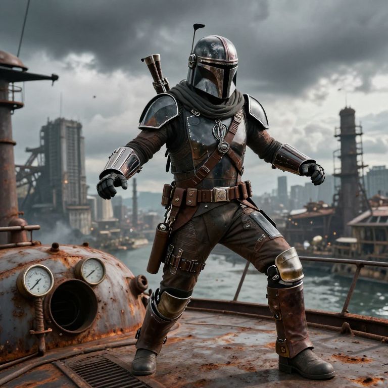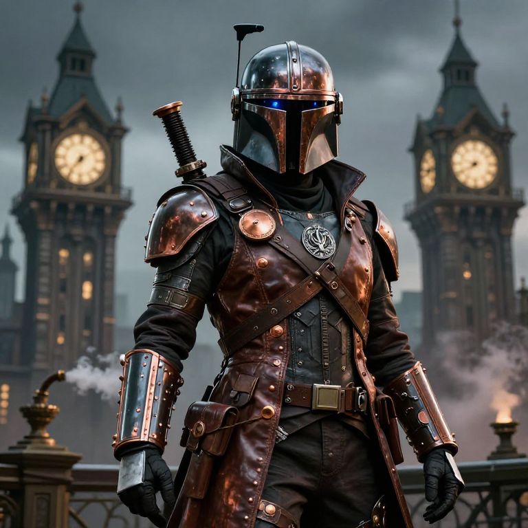 Portrait of a Steampunk Mandalorian bounty hunter, enhanced with copper rivets and steam vents, glowing blue eyes behind goggles, wearing a long leather coat with gear motifs, backdrop of Victorian-style clock towers and steam vents, cinematic and intense.