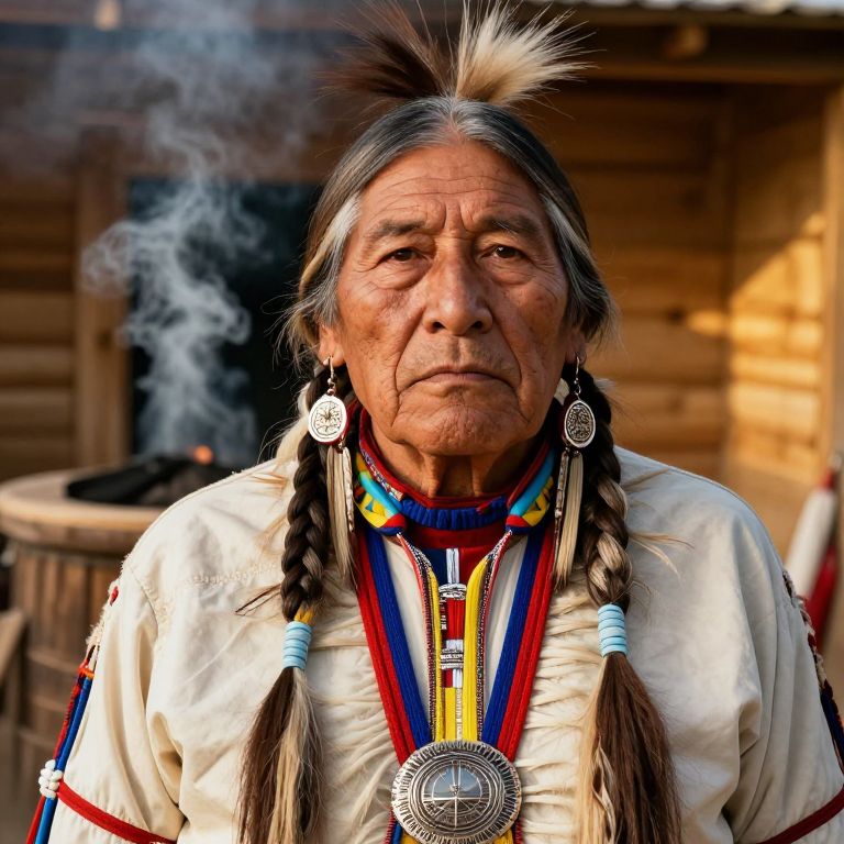 Photograph of an elderly Native American man with long, gray braided hair adorned with a white feather. He wears a white shirt with blue, red, and yellow striped necklaces, and large, circular silver earrings. His weathered face shows deep wrinkles and a serious expression. A large, circular silver medallion hangs around his neck. In the blurred background, there is a wooden structure with a barrel and smoke rising from a fire. The lighting is natural, highlighting his face and hair. The image has a vibrant, high-contrast style.