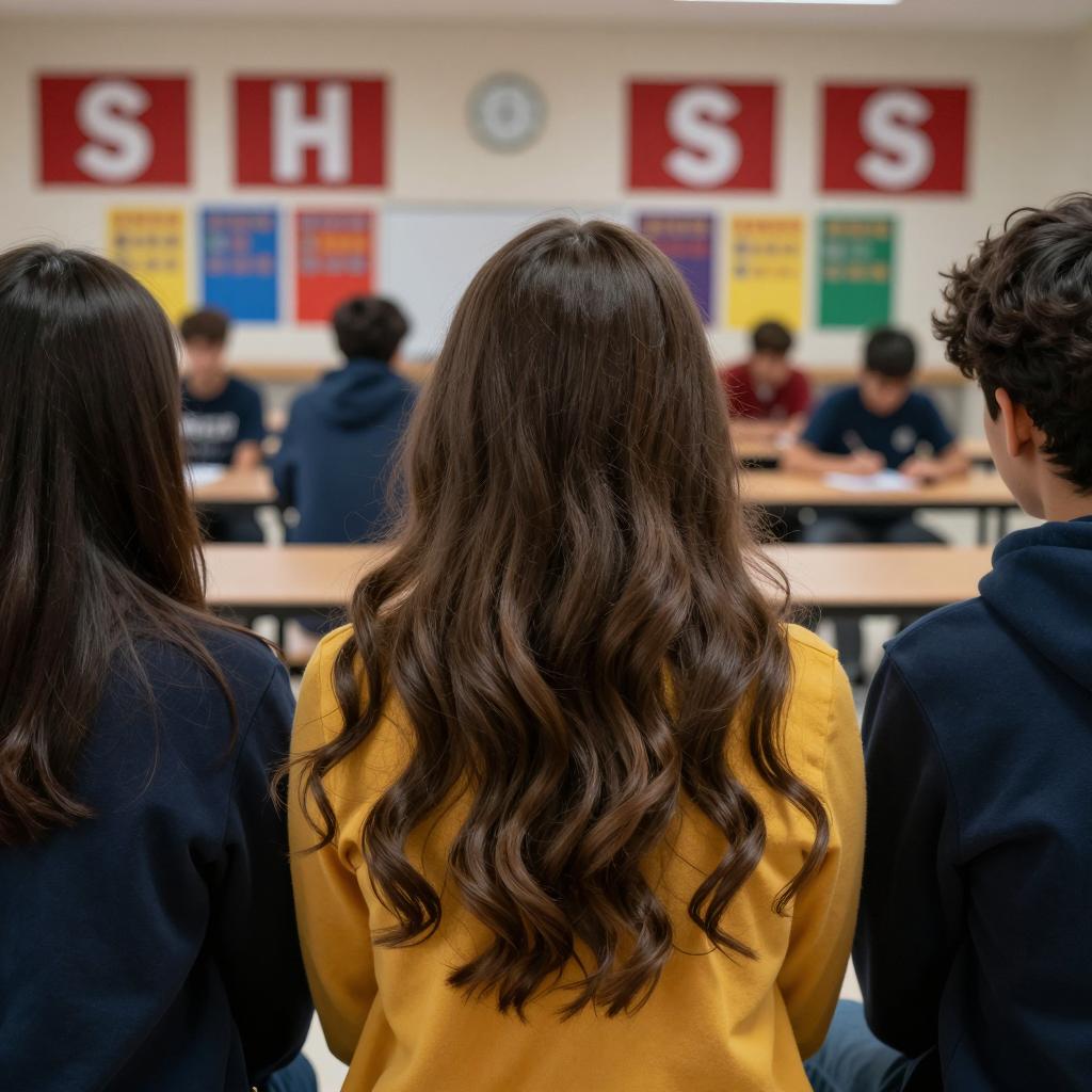 School cafeteria scene, photograph. Three people with their backs to the camera, central person with long wavy brown hair, wearing a yellow top. Two people on left and right with dark hair. Background: students at tables, red banners with white s on walls, clock on wall, multi-colored posters. Dim lighting, people mostly in casual clothing. Central figure's hair in focus, others slightly blurred.