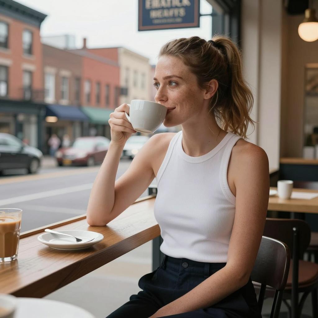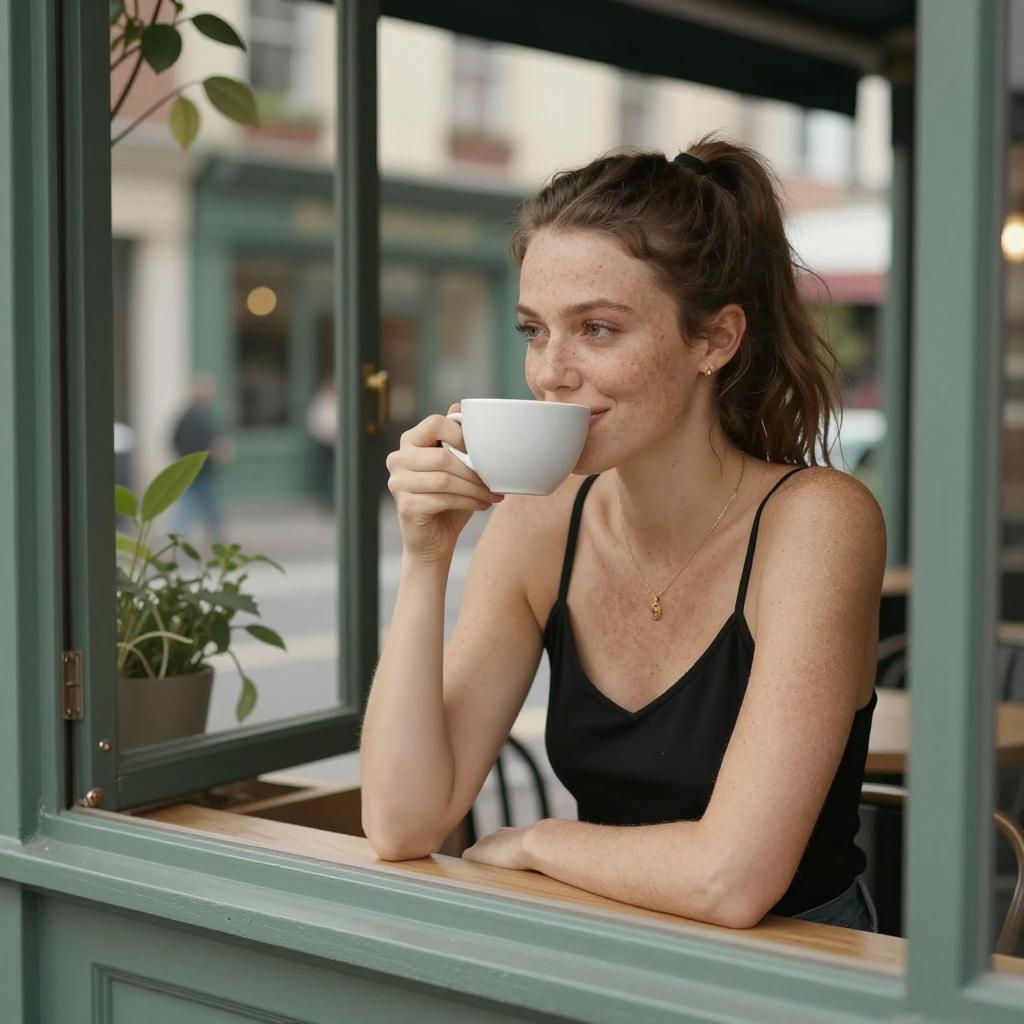 Photograph of a woman with wavy blonde hair, wearing sunglasses, a sleeveless white top, and dark pants, standing near a glass door. She is sipping from a cup, smiling. Sunlight streams through the glass, illuminating green plants outside. She stands slightly to the right, leaning against the door frame. Bright, natural light.