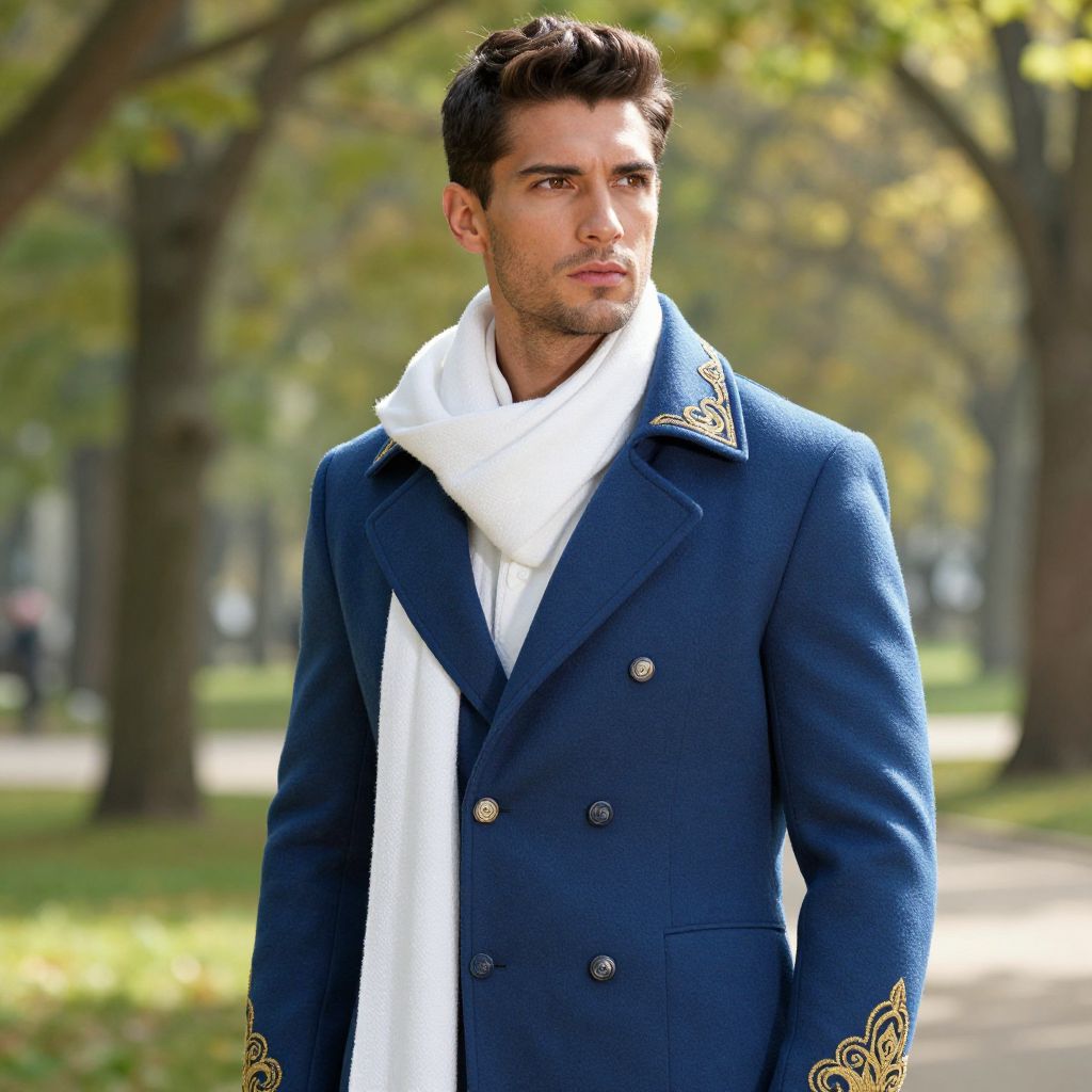 Man with dark hair and a beard wearing a red jacket with gold embroidery and a white shirt.