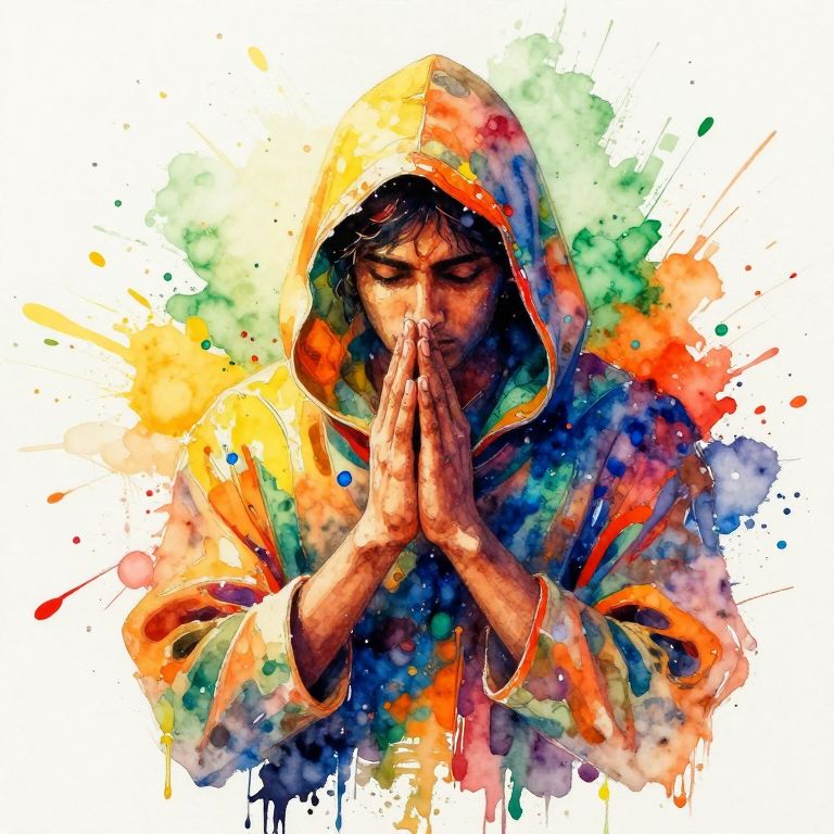 The image is a vibrant watercolor painting in the style of Indian artist Milind Mulick, featuring a person wearing a hooded garment. The individual's hands are clasped together in a gesture of contemplation or prayer, with fingers interlaced and palms pressed together. The background is a burst of colorful splashes and drips, predominantly in shades of green, yellow, orange, and blue, creating a dynamic and energetic atmosphere. The person's hood is adorned with a mix of these colors, adding depth and texture to the artwork. The overall composition is balanced, with the hands centrally positioned and the colorful splashes radiating outward, drawing the viewer's eye across the entire canvas. The interplay of colors and the fluid, expressive brushstrokes give the painting a sense of movement and life, capturing a moment of introspection or devotion.