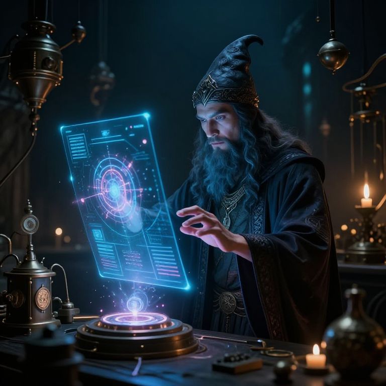 Photograph of a bearded, long-haired wizard with fair skin and a serious expression, wearing a black, pointed hat adorned with intricate gold patterns, and a dark robe with similar embellishments. He stands in a dimly lit, medieval-style room with candles casting a warm glow. In front of him, a glowing blue holographic tablet displays a magical circle and text, floating above a circular, illuminated base on a wooden table. The background includes hanging lanterns, a clock, and various metallic objects, creating a mystical, alchemical atmosphere. The wizard's right hand is raised, interacting with the hologram.