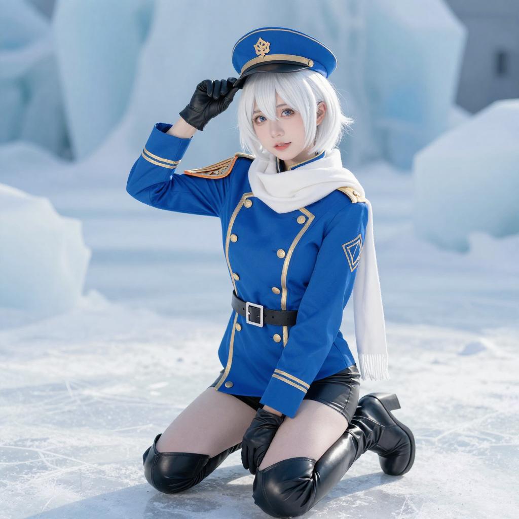 A digital CGI image of a cosplayer with white hair, wearing a blue and white ornate outfit with gold accents, black gloves, and a matching hat. She strikes a playful pose, one leg raised, against a bright, icy blue background. Her outfit includes a short white skirt and blue boots with white fur trim.