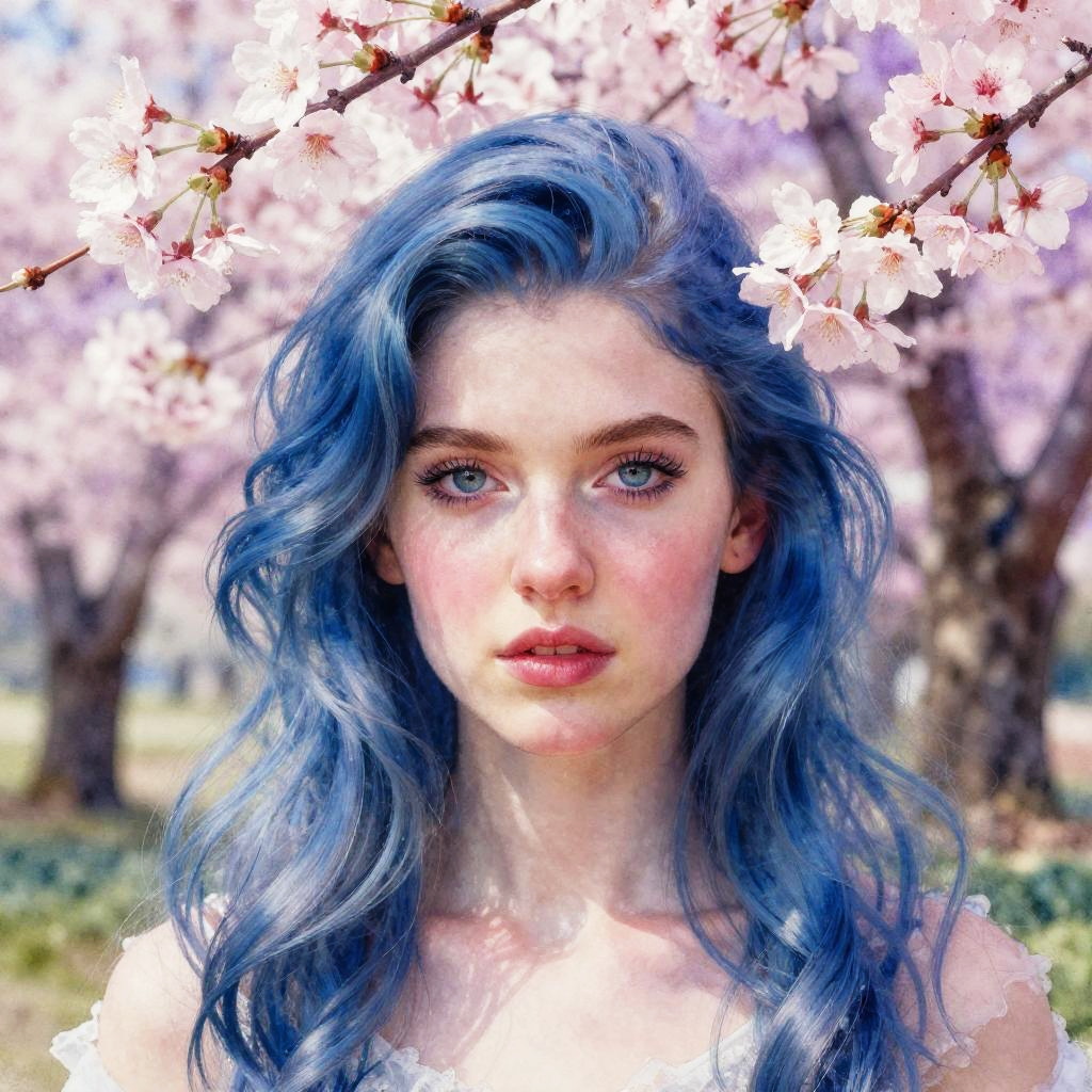 Realistic photo.Jasper the Mystic in a mystical landscape with cherry blossoms, painted by James C. Christensen, powder blue and lavender color gradient, beautiful eyes, watercolor, best quality, detailed and expressive realistic photo