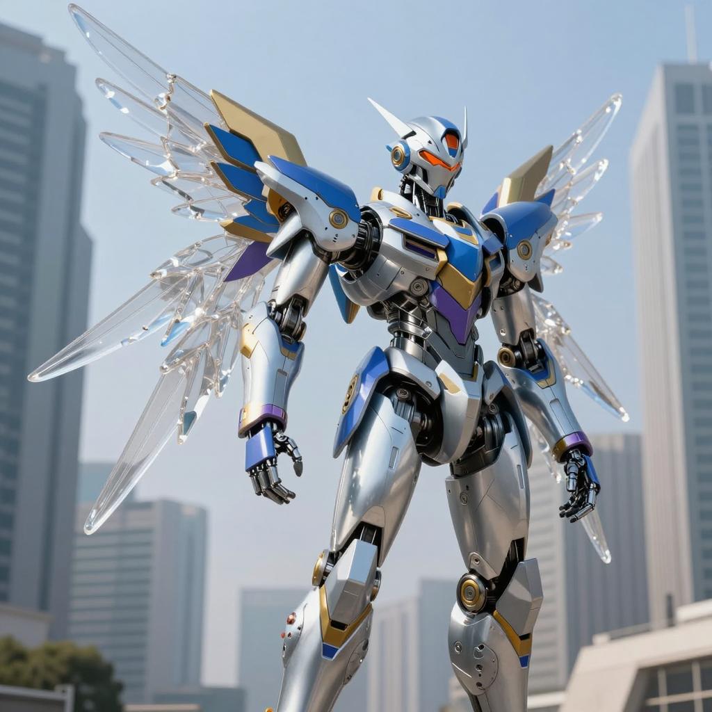 A sleek futuristic humanoid robot stands in an urban cityscape featuring tall skyscrapers. The robot is adorned with metallic silver armor accented with blue, gold, and purple. Transparent crystal-like wings extend from its back, and it has a modern helmet with an orange visor. The design showcases intricate mechanical joints and a high-tech aesthetic under a clear sky.