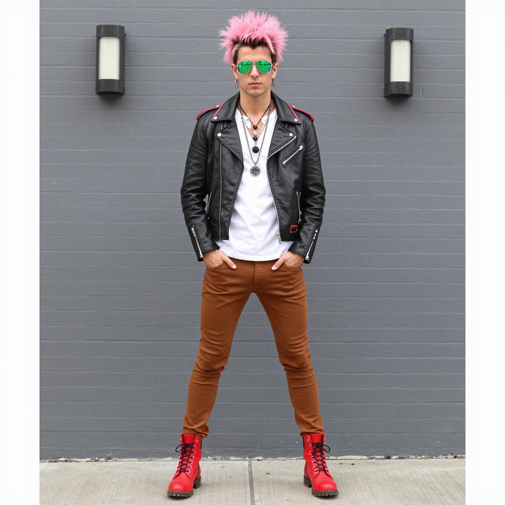Glam rock fancy dress, photograph of a young man with spiky orange hair, wearing black sunglasses, a shiny pink leather jacket with black and silver studs, black shirt underneath, multiple layered necklaces, black belt with gold chains, gray background, rockstar style, mid-shot, studio lighting, confident expression, fashion, punk influence
