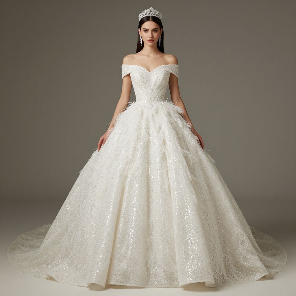 Elegant off-shoulder long ball gown featuring intricate sequin embellishments and cascading feather details, paired with a sparkling tiara and dangling earrings, exudes bridal radiance against a muted backdrop.