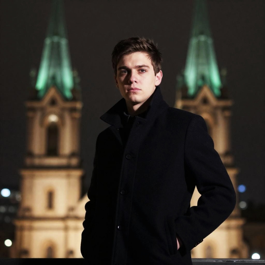 Photograph of a young man with short brown hair, serious expression, wearing a dark coat, standing in front of illuminated, green-tipped church spires at night. Blurred city lights in background. He has his right hand on his hip.