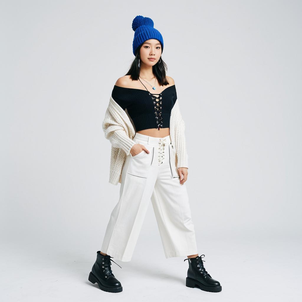 Woman, street style, black crop top with a plunging neckline, white high-waisted wide-leg trousers with large pockets, cream knit cardigan worn off-the-shoulder, black lace-up ankle boots, bright blue knit beanie, minimalistic pendant necklace, white studio background.