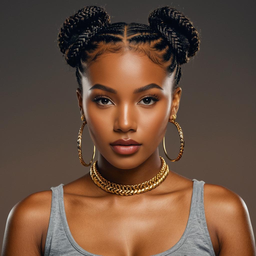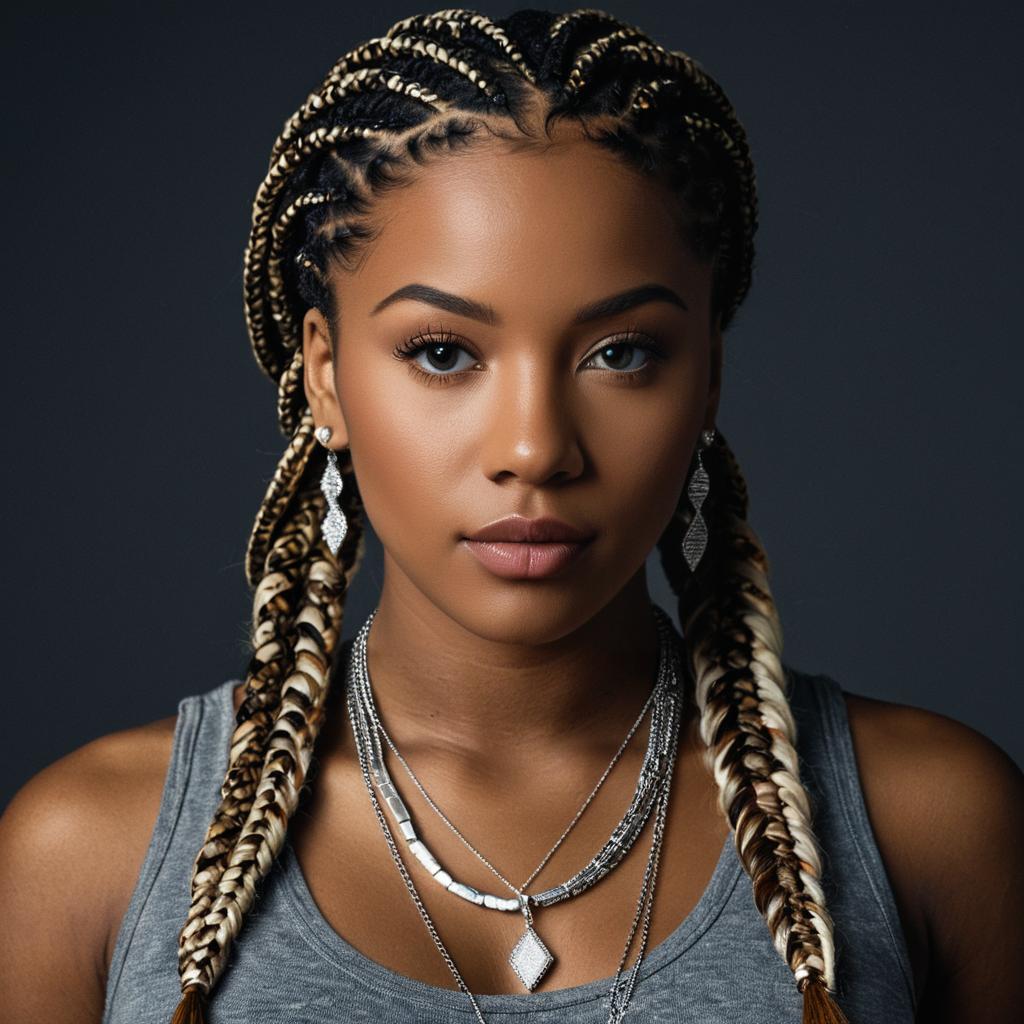 Photorealistic close-up portrait of a young Black woman with long, brown twisted dreadlocks styled in individual soft locs. She wears large silver hoop earrings and two silver necklaces with circular pendants, paired with a dark gray t-shirt. The image features smooth dark skin, brown eyes, a neutral expression, and soft studio lighting against a blurred dark brown background.