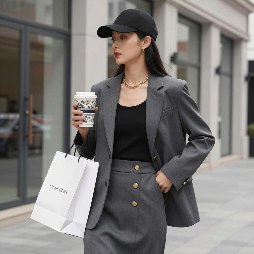 Photograph of a woman in a concrete parking garage. She has dark hair, wears black sunglasses, a white long-sleeve shirt, black sleeveless vest, and grey pants. She holds a McDonald's drink cup and two fashion magazines in her right hand. Her left hand touches her hair. She has a slightly open mouth, looking to the side. The background consists of grey concrete pillars and walls. The woman stands upright, facing slightly to the right.