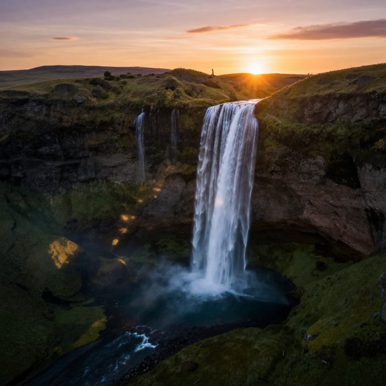 Photograph of a majestic waterfall cascading down a dark, rocky cliff during sunset. The sun, a glowing orange, sits just above the horizon, casting warm light across the scene. The waterfall, with white, shimmering water, contrasts against the dark cliffs and green, grassy tops. Mist rises from the base of the waterfall, blending with the dark water below. A small silhouette of a person stands on the cliff's edge, adding a sense of scale and adventure. The sky is a gradient of orange, pink, and purple hues, with scattered clouds. The overall scene is dramatic and picturesque.