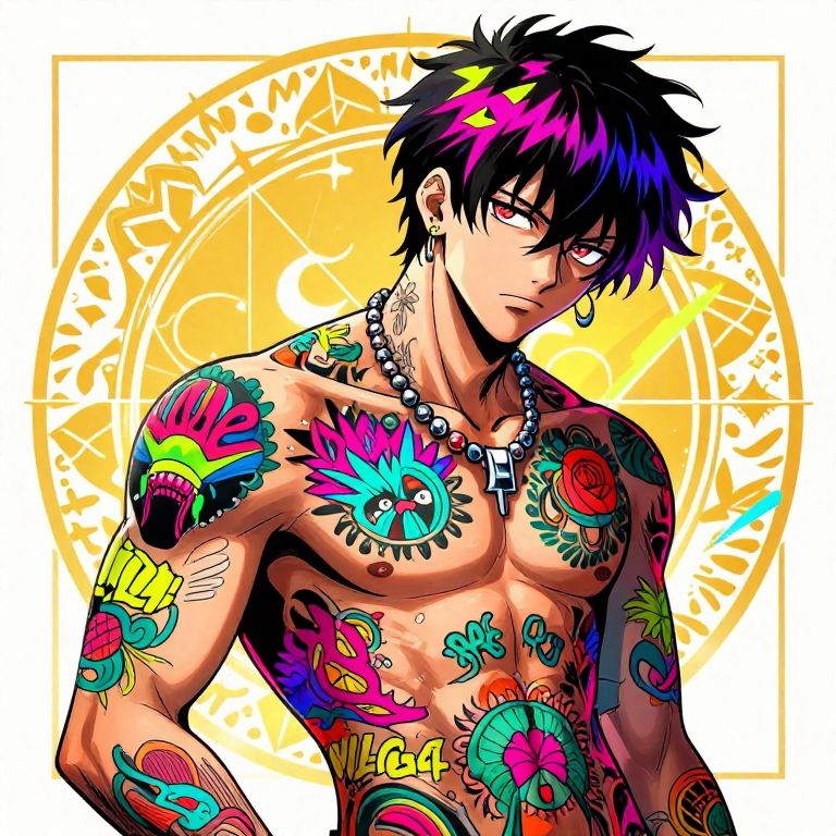 Tattooed, muscular anime man with black, spiky hair, colorful tattoos, necklace, and earrings, stands confidently against a yellow, circular