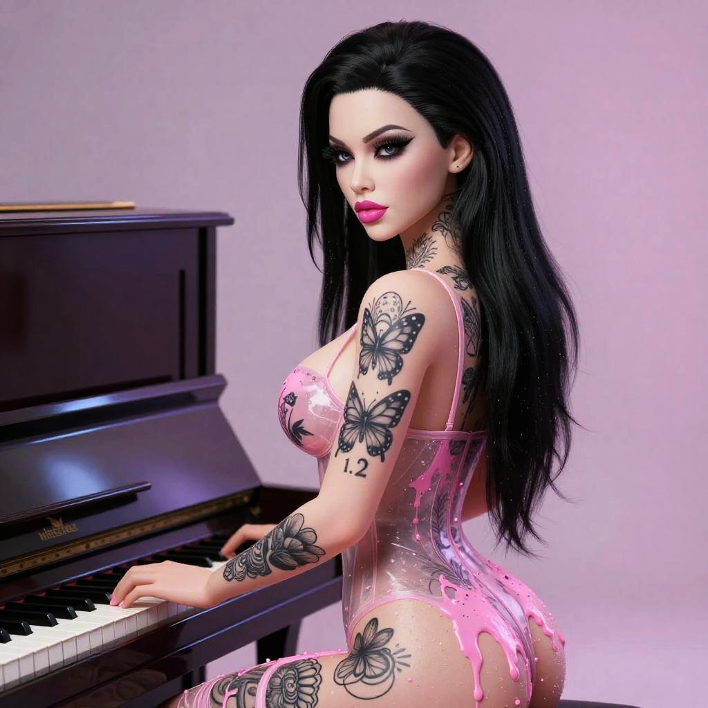 Woman, ultra detailed digital art, makeup, goth, dress, (tattoos:1.2), hairstyle, piano, Peter Mohrbacher, realistic eyes, 3d model, doll, lips, dramatic, pink lips, (thepit style:0.9), (delightful:0.9), splash of pink paint on body, see-through, ([person|Karen Gillan|Sandra Bullock]:0.85), back, from from behind, ass, trending on artstation, sharp focus, perfect composition, concept art, 8k, studio photo, ethereal colors background, volumetric lighting, light studio, vibrant, big breasts
