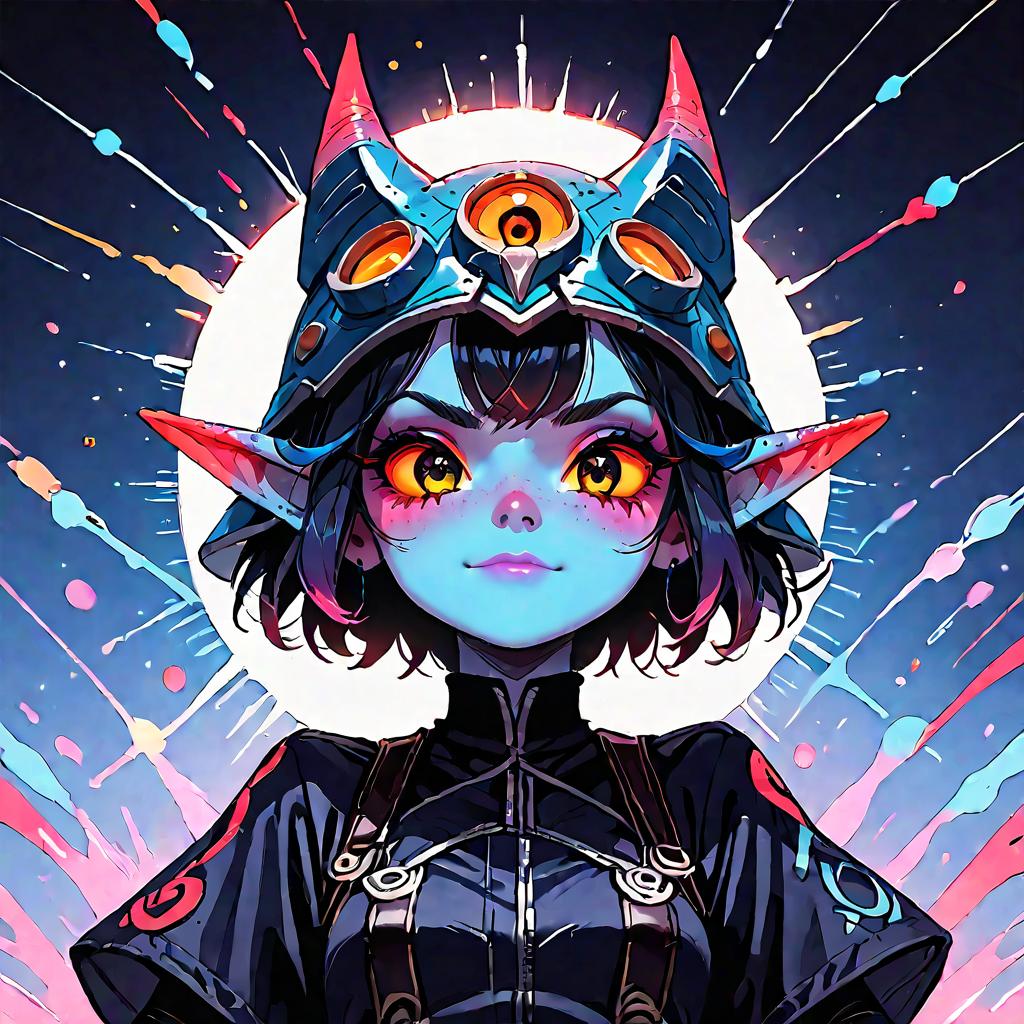 Digital anime-style illustration of a boy with short black hair and vivid amber eyes, smiling and holding a vintage microphone. The character has distinctive blue-toned skin and wears a black suit jacket over a striped white and blue shirt. The background features bright blue skies with stylized clouds and abstract colorful splashes, suggesting a lively and energetic atmosphere.