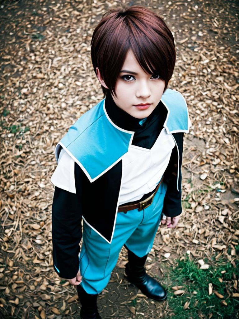 Photo-realistic cosplay photo of person in asbel lhant costume. 1boy, blue eyes, brown hair, short hair. full body shot