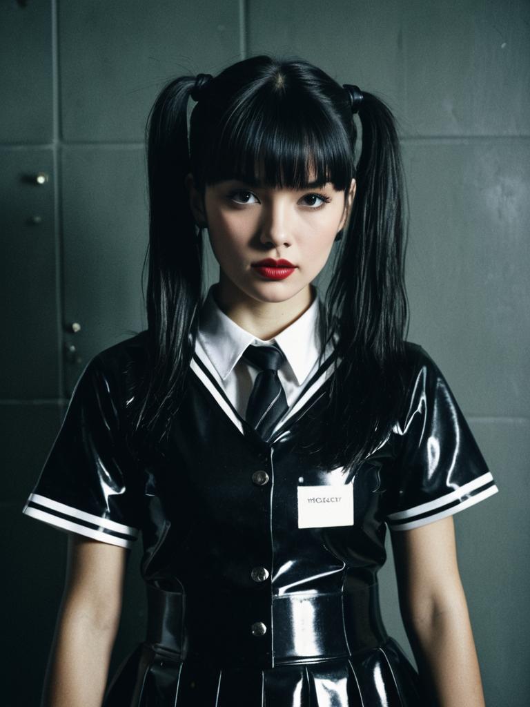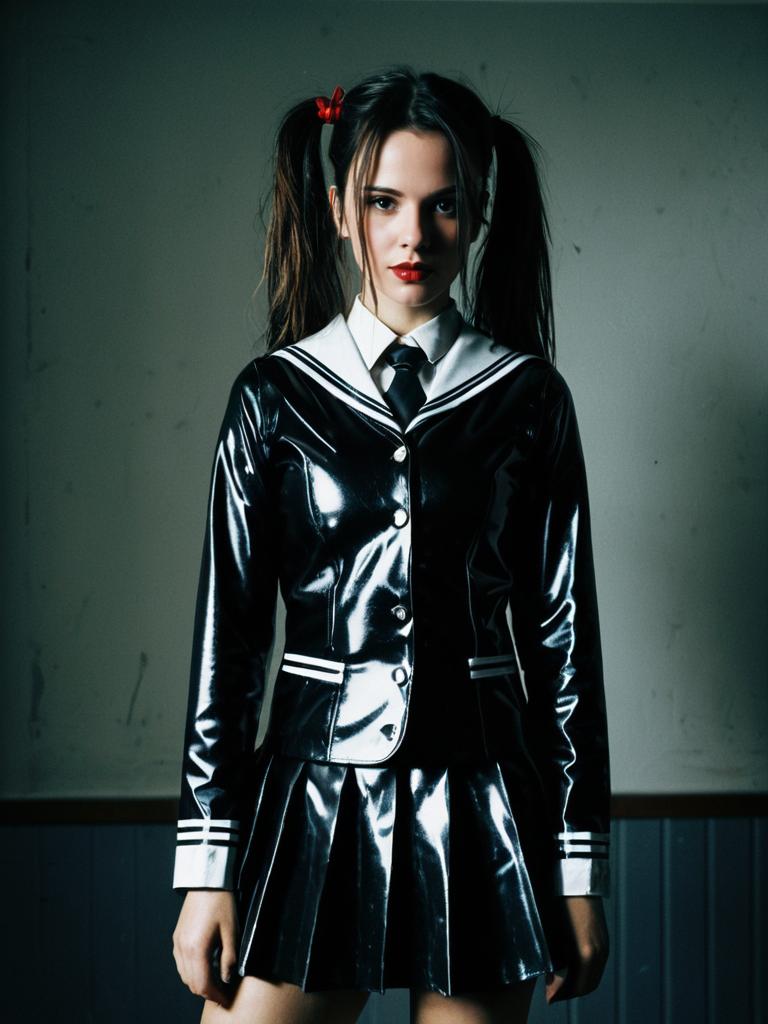 Woman in Latex Schoolgirl Costume, cinematic realism, edgy dramatic portrait