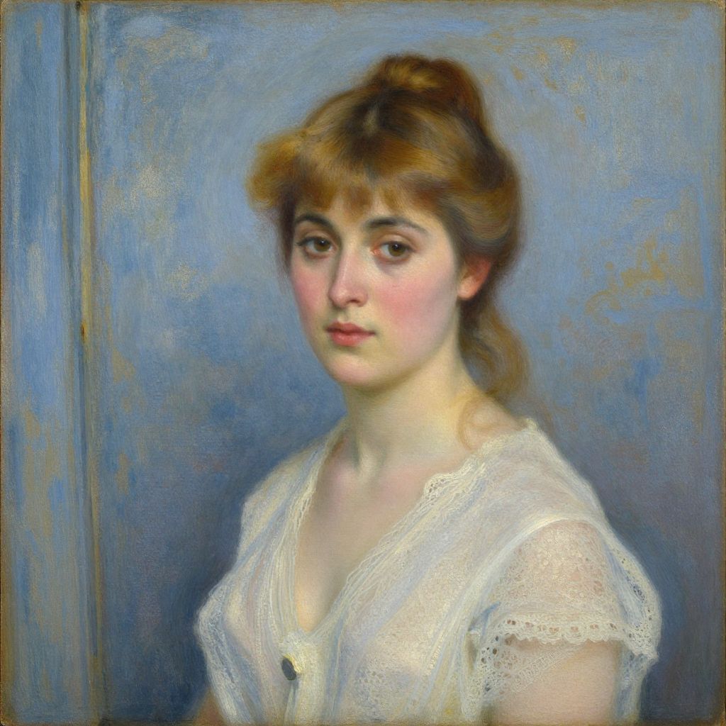 Impressionist-style painting of a young woman with fair skin, light brown hair, and pink cheeks, wearing a white lace blouse, against a blue