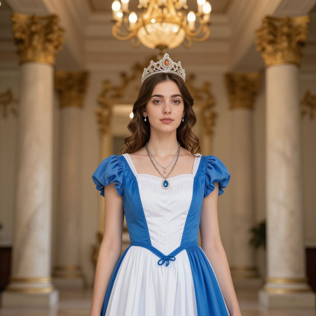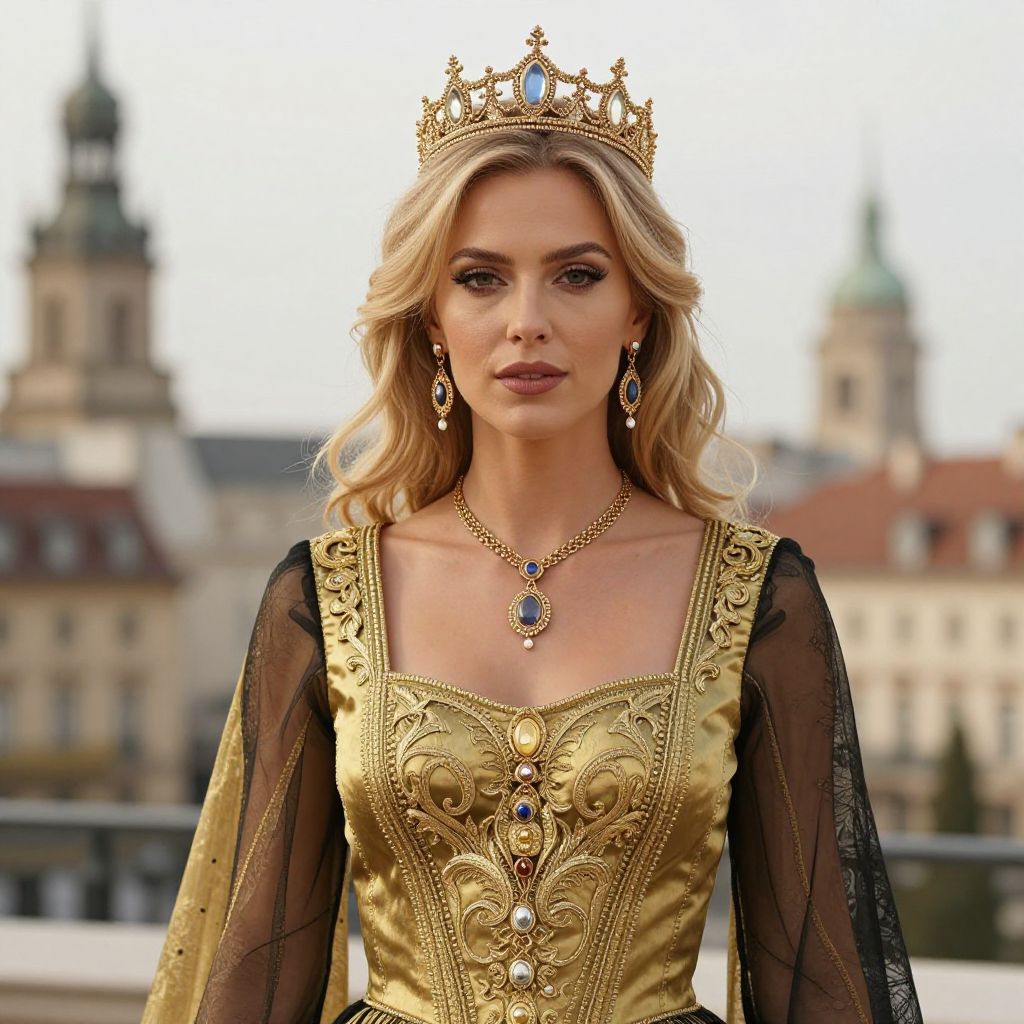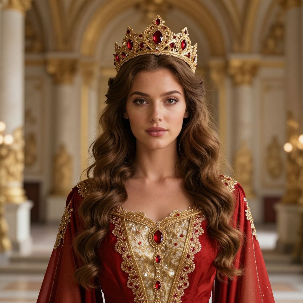 A woman in a red and gold outfit with a crown on her head is standing on a street. There are buildings and trees behind her.