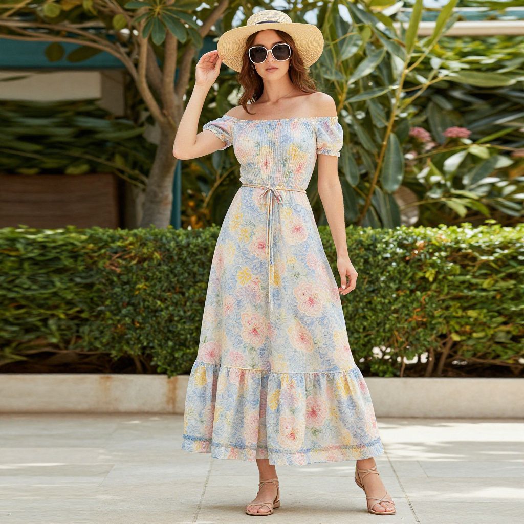 Photograph of a slender woman standing outdoors on a sunny day. She wears a light, off-shoulder, floral dress with a ruffled hem, and beige strappy sandals. Her long brown hair peeks out from under a wide-brimmed straw hat, and she has on round, dark sunglasses. The dress features a pastel flower pattern with shades of pink, yellow, and blue. The background shows green shrubs and trees, with sunlight filtering through the leaves, casting dappled shadows on the stone-paved ground. The woman stands confidently with one hand adjusting her hat.