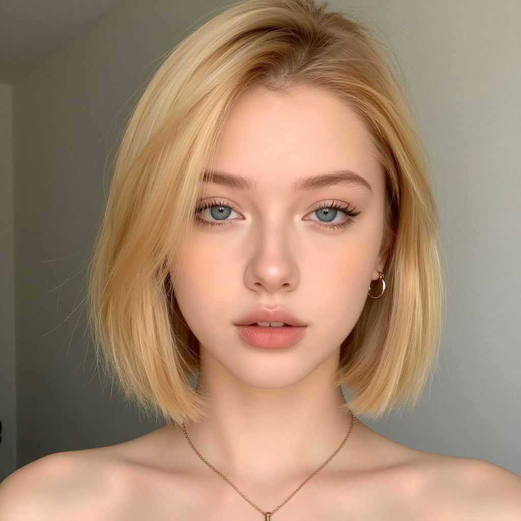 Photograph of a young woman with fair skin and short, straight, blonde hair that frames her face. She has blue eyes, light pink lips, and subtle makeup. She wears small gold hoop earrings and a thin gold necklace. Her expression is neutral, with a slight, calm gaze directed at the camera. The background is a simple, softly lit, grayish wall, creating a minimalistic and focused composition. The lighting is natural, highlighting her clear complexion and delicate features. She appears to be topless, with her shoulders and collarbone visible. The overall style is modern and naturalistic.
