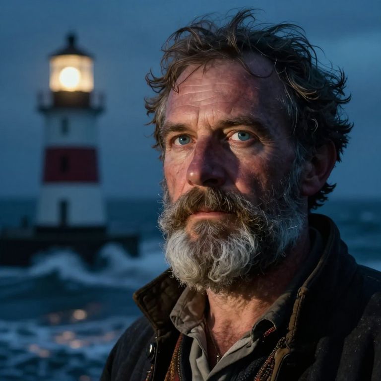 Photograph of a middle-aged man with a rugged appearance, featuring a graying beard and curly, unkempt brown hair. He has blue eyes and a weathered face, illuminated by a blue twilight sky. He wears a dark brown jacket over a beige shirt. In the blurred background, a brightly lit lighthouse with black and white stripes stands against a dark, stormy sea. The man's expression is serious and contemplative, with the lighthouse light casting a warm glow on his face, contrasting with the cool tones of the surrounding sea and sky.